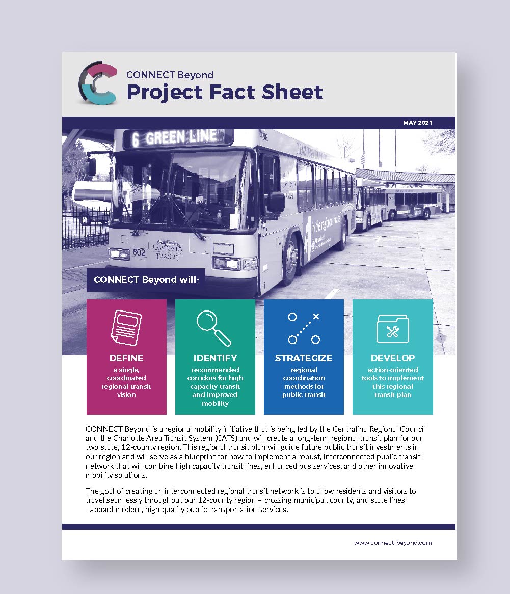 CONNECT Beyond is a regional mobility initiative that is being led by the Centralina Regional Council. CONNECT Beyond will create a bold regional transit plan that provides real mobility solutions and opportunities for residents and visitors across 12 counties in North and South Carolina.